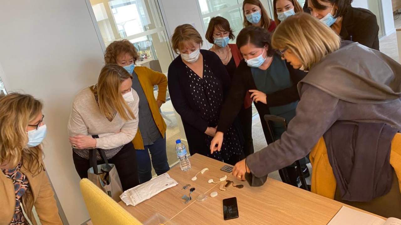 Les trois bénévoles ont ensuite rencontré une dizaine de collaborateurs du service Souscriptions. Catherine a alors pu présenter l’association, les processeurs et les accessoires devant un auditoire très intéressé de voir des implantés et leurs processeurs « en vrai ».
